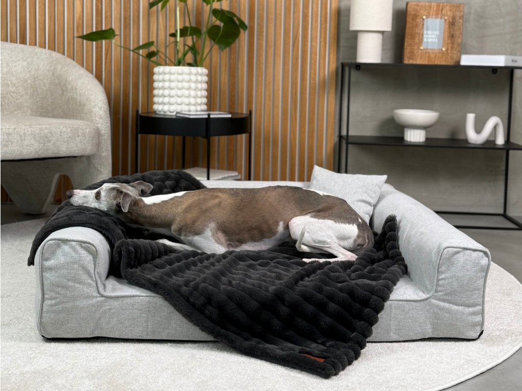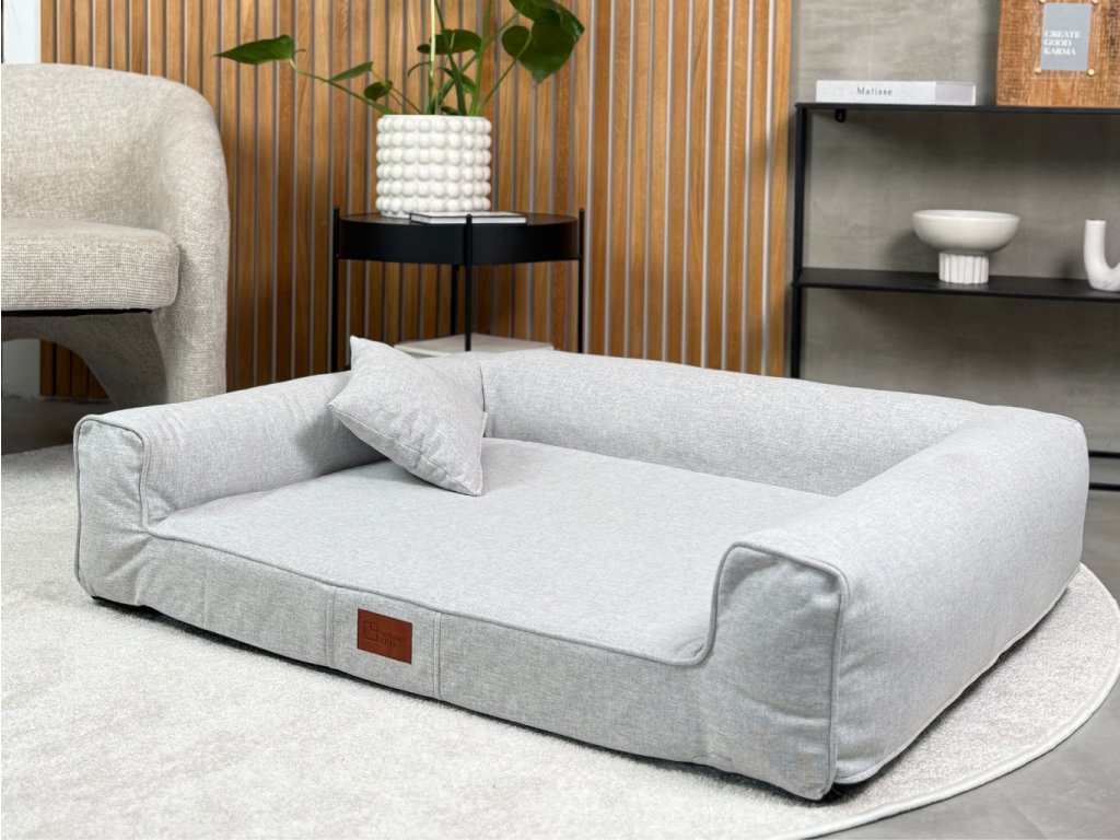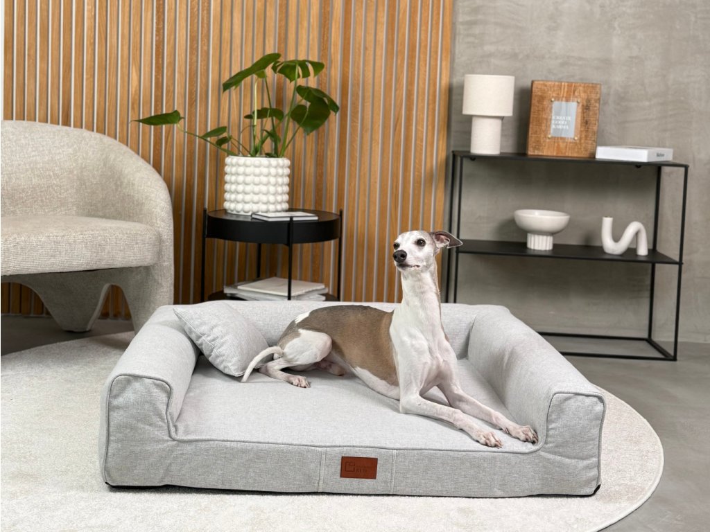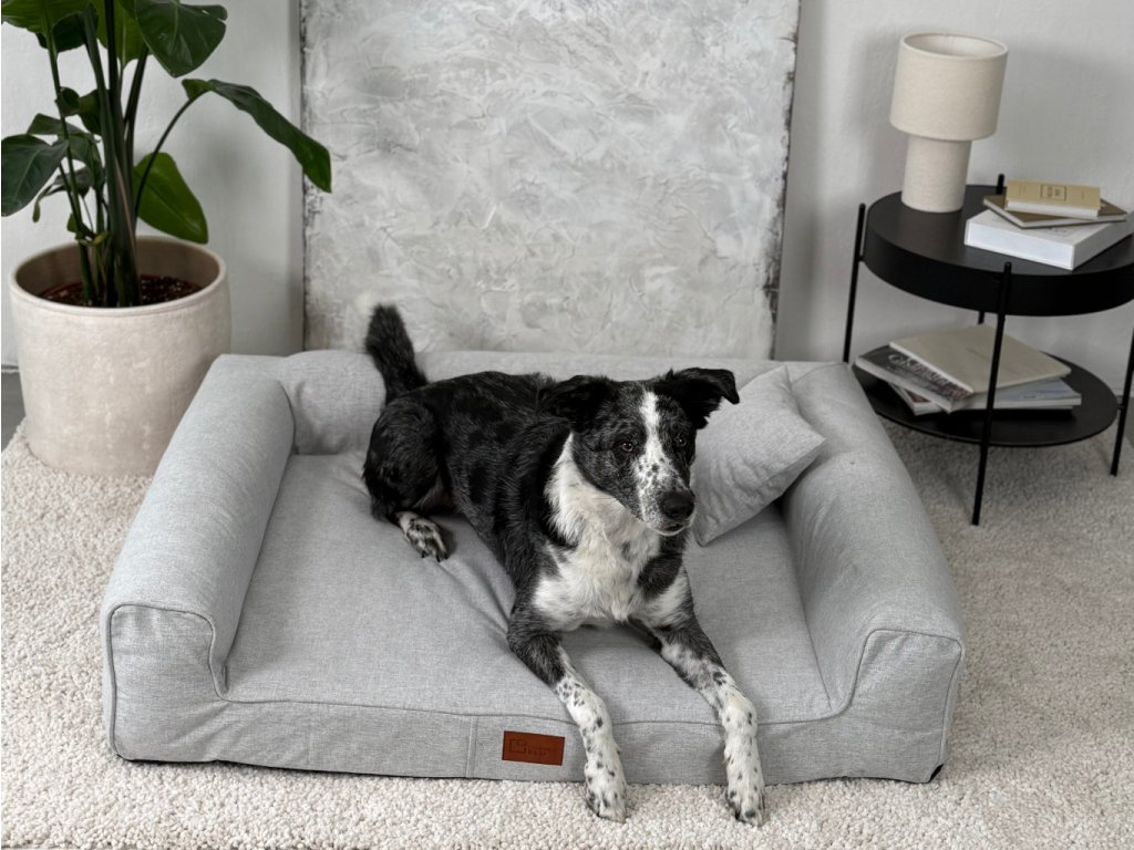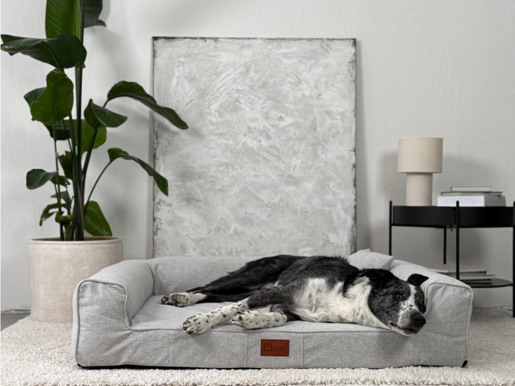 SOFI KENYA šedý pelíšek pro psy, který má pouze 3 boky. Díky tomu je skvělý pro pejsky, kteří už nepřekročí přední okraj a nebo by mohli zakopnout. Tím je SOFI bezpečnější a přitom velmi pohodlný.